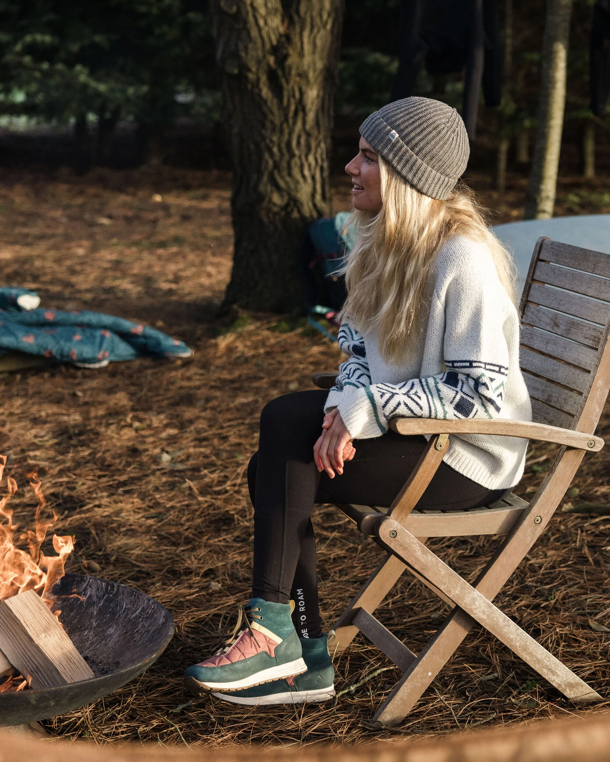 Flüchte in die von Baumkronen bedeckte Wildnis mit dem Ambience Strick. Hergestellt aus recyceltem Garn mit einem gemütlichen Stehkragen, ist es perfekt für die Nächte am Lagerfeuer.