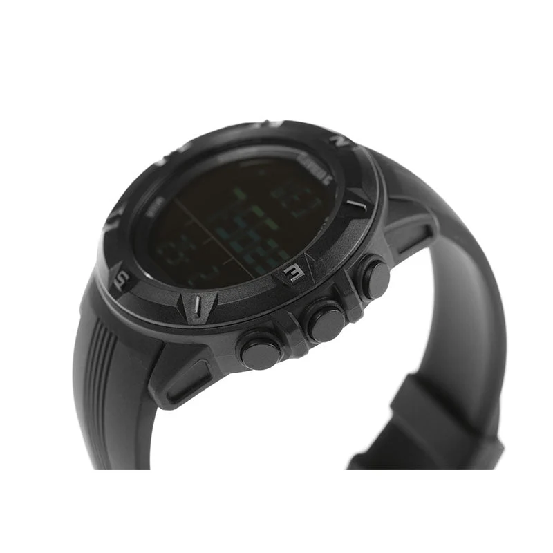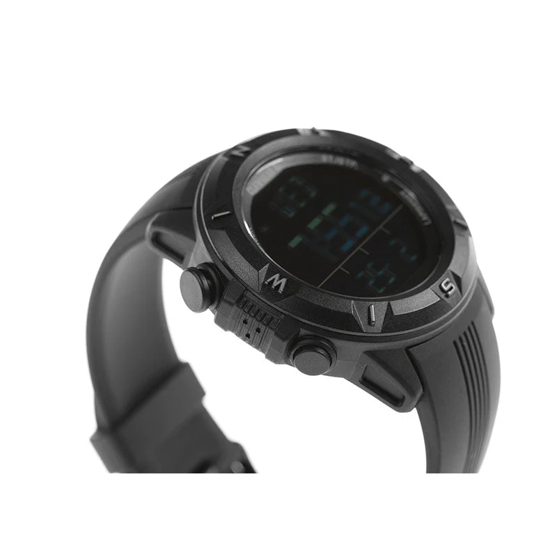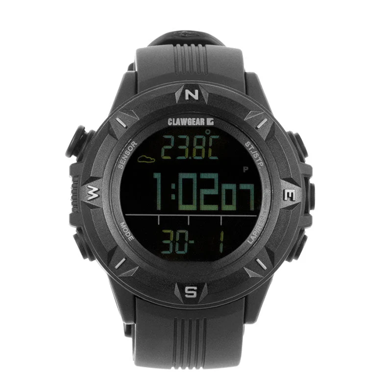 Mission Sensor II in Black von Claw Gear ist eine zuverlässige Uhr für Militär und Polizei, die äußerst funktional ist. Die Uhr hat eine Box aus Polycarbonat, ein klassisches Design ohne Metallteile, die Blendung bieten können, einen digitalen Kompass, ein Barometer und vieles mehr. Ton kann stummgeschaltet werden.
