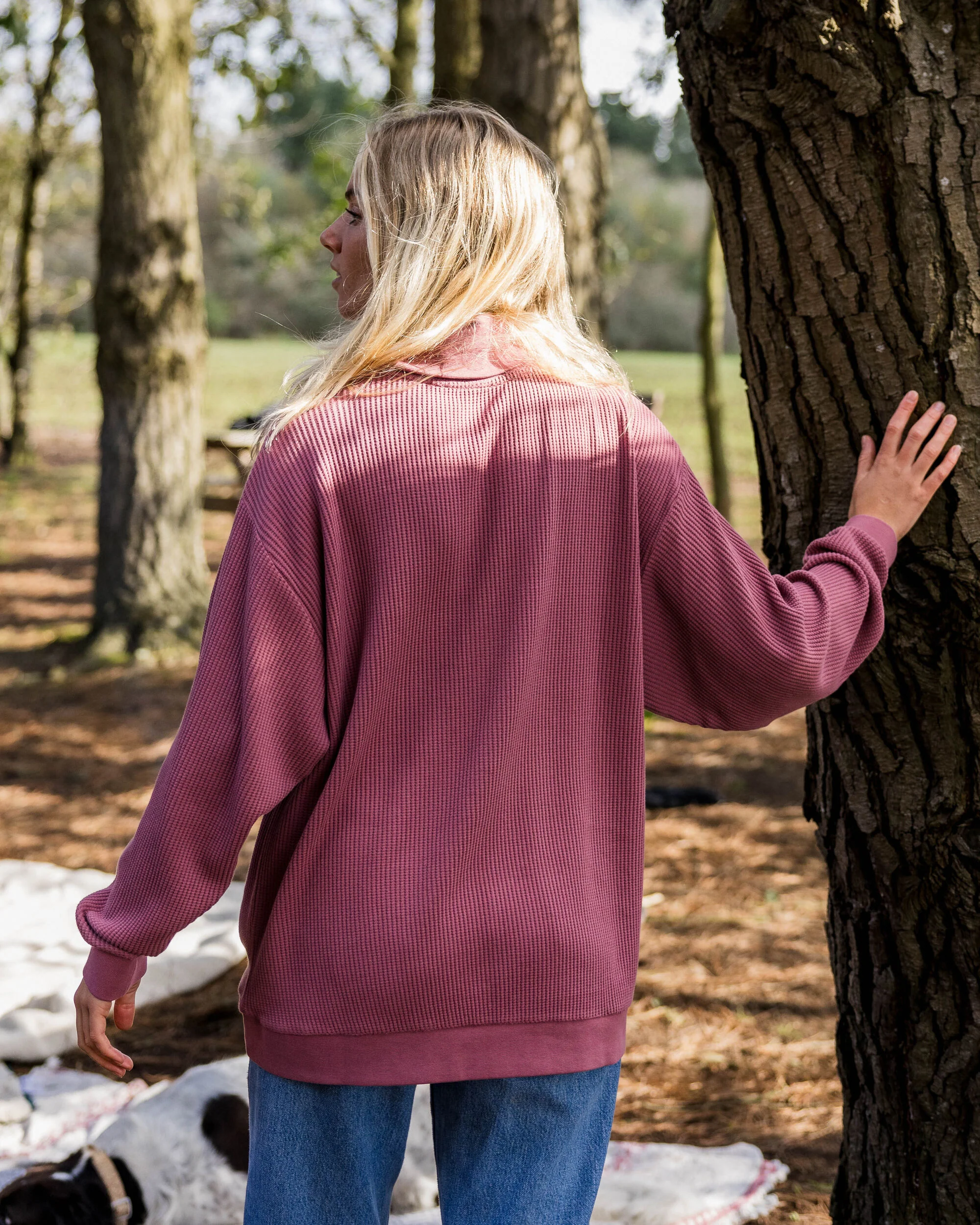 Der Flourish ist ein mittelschwerer Polo-Neck-Top aus strukturiertem Waffelstoff, locker geschnitten am Körper und Ärmel. Entworfen, um bequem zu tragen. Für eine engere Passform eine Größe kleiner wählen.