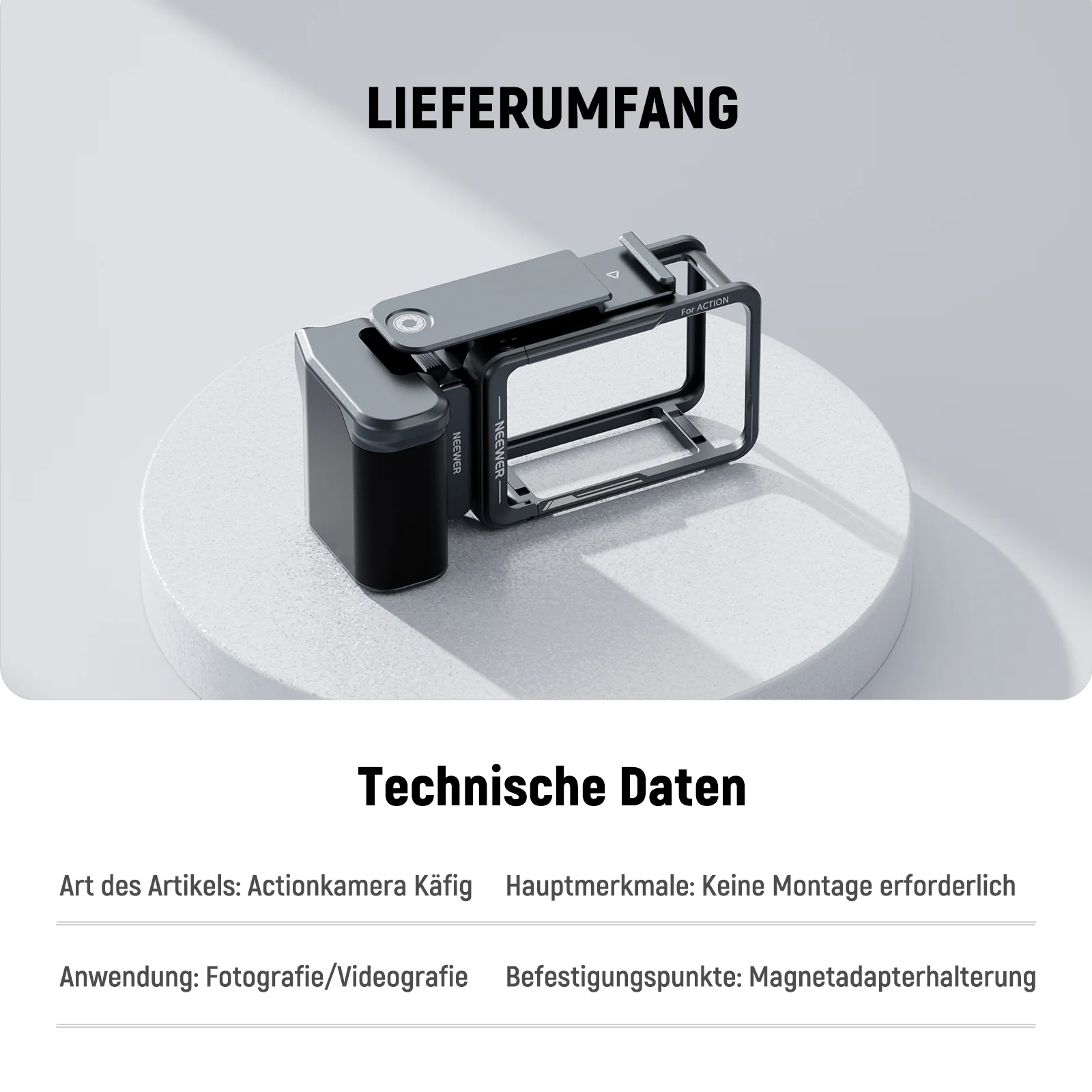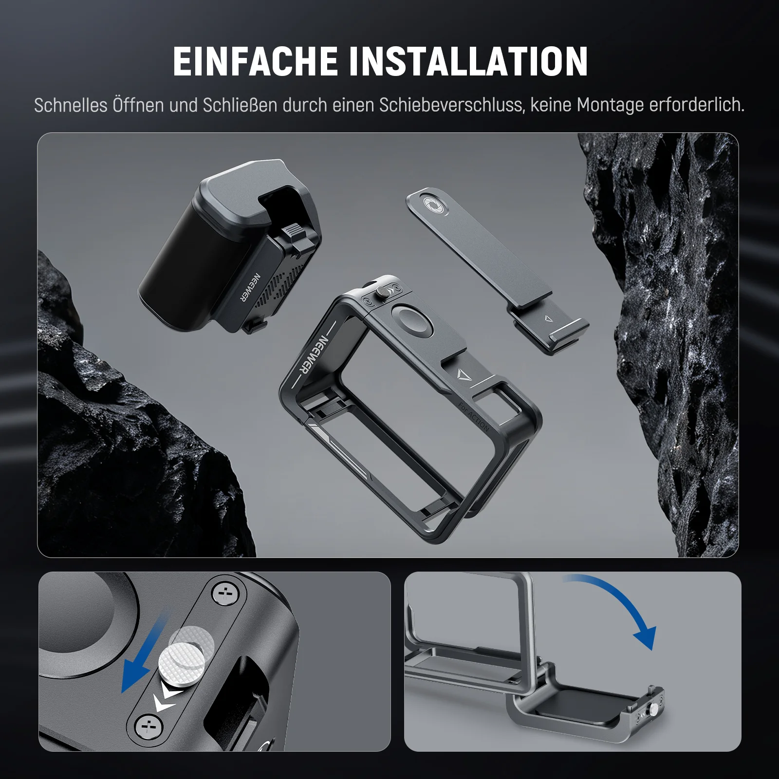 - Keine Montage & voller Zugriff– Dieser Käfig lässt sich schnell über einen Schiebeverschluss öffnen und schließen und erfordert keinerlei Montage. Schieben Sie einfach Ihre Action Kamera hinein und beginnen Sie mit dem Vloggen, der Aufnahme von Videos für soziale Medien, der Videografie und dem Filmen. Durch den uneingeschränkten Zugriff auf den USB C Anschluss bleibt Ihre Action Kamera vollständig kompatibel mit DJI Mic RX