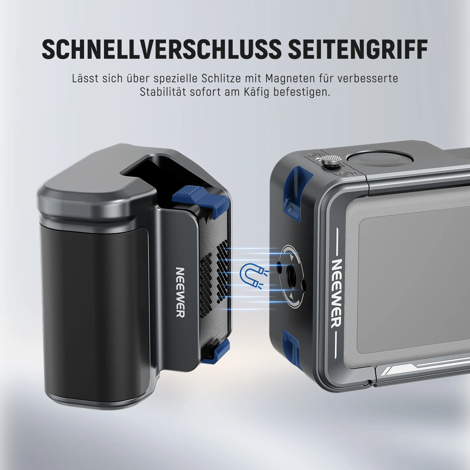 - Schnellverschluss Seitengriff– Der Schnellverschluss Griff wird über die dafür vorgesehenen Schlitze fest am Käfig befestigt und ermöglicht so komfortables Filmen aus der Hand. Er verfügt über ein 1/4″ Gewinde für die Befestigung eines Stativs. Die mitgelieferte Verschlussverlängerungsstange wird über den Cold Shoe des Käfigs befestigt. Außerdem verfügt sie über einen zusätzlichen Blitzschuh. Hinweis: Der Seitengriff kann nur mit dem Käfig AC014 verwendet werden, nicht mit der Kamera