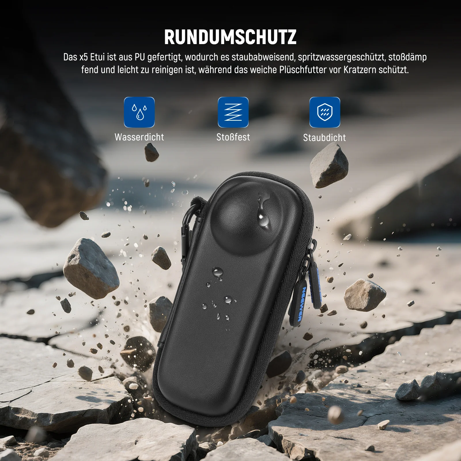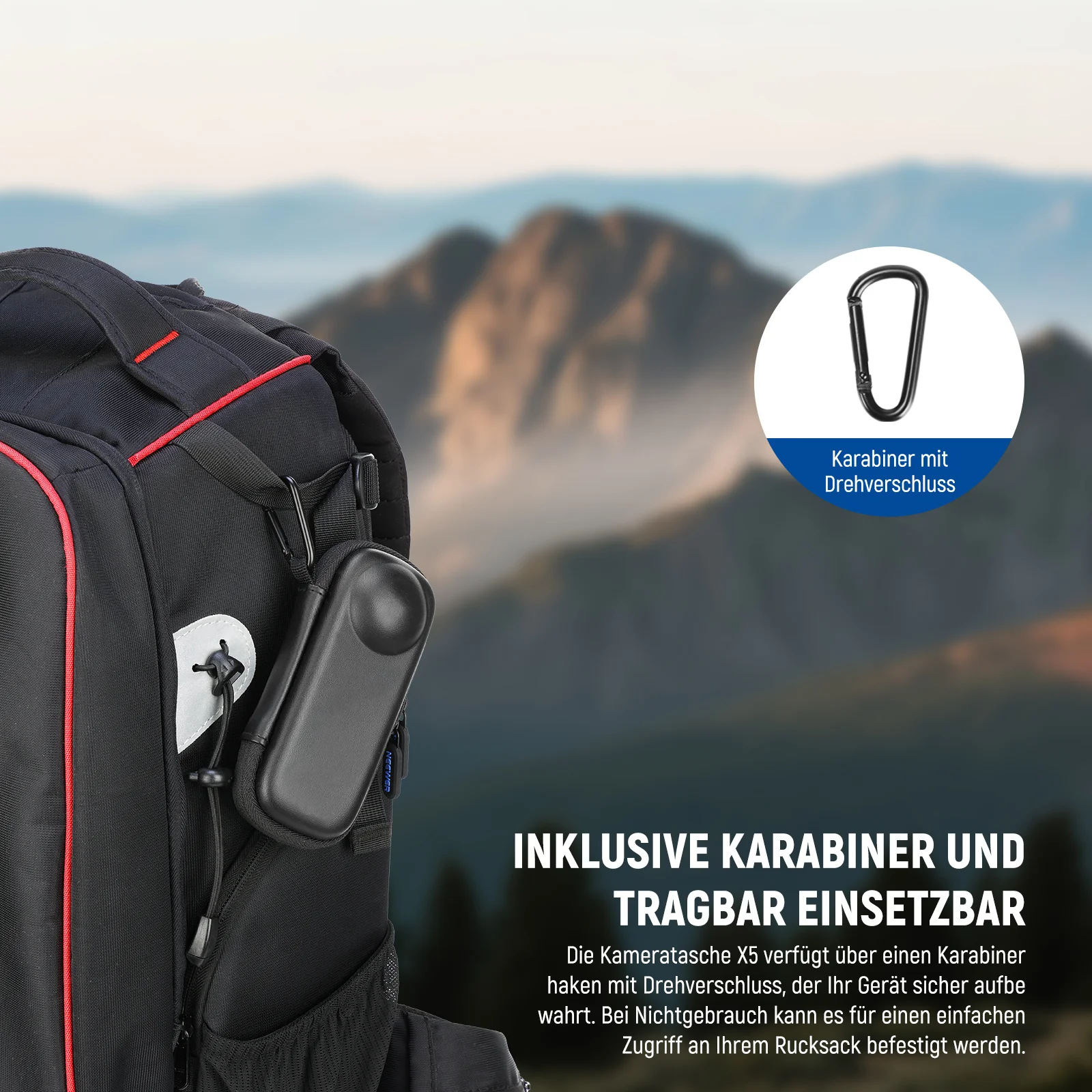 - Inklusive Karabinerhaken für bequemes Tragen– Das X5 Kameragehäuse verfügt über einen Karabinerhaken mit Drehverschluss, der Ihr Gerät sicher aufbewahrt und ein versehentliches Herunterfallen verhindert, während es an Ihrem Rucksack befestigt ist. Mit einem Gewicht von nur 98g passt sie problemlos in Ihren Rucksack oder Ihre Tasche. Wenn die Tragetasche nicht in Gebrauch ist, kann sie sicher am Karabiner befestigt werden, sodass sie stets griffbereit ist