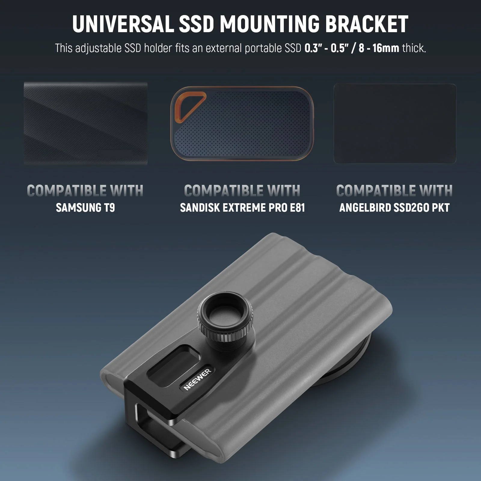 - Universelle SSD Halterung– Diese 40mm–65mm verstellbare, federbelastete Klemmhalterung ist kompatibel mit Samsung SSD T5/T7/T7 Shield, kompatibel mit San Disk Extreme Pro 1 TB 2 TB SSD E30/E61/E81. kompatibel mit G Technology G DRIVE Mobile SSD, kompatibel mit Glyph Atom SSD, kompatibel mit Angelbird SSD2go PKT und anderen gängigen SSD Festplatten