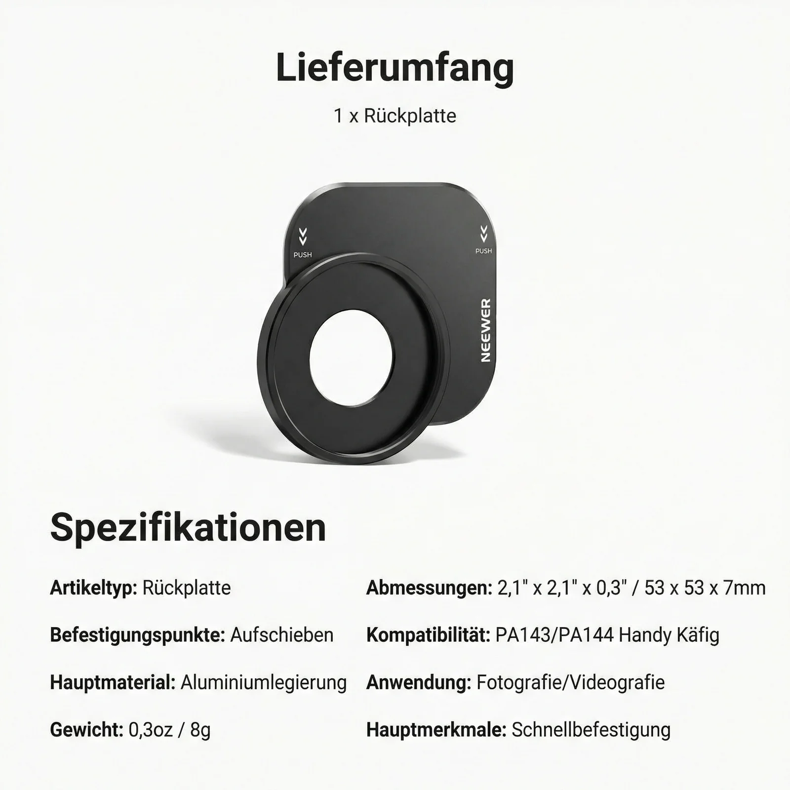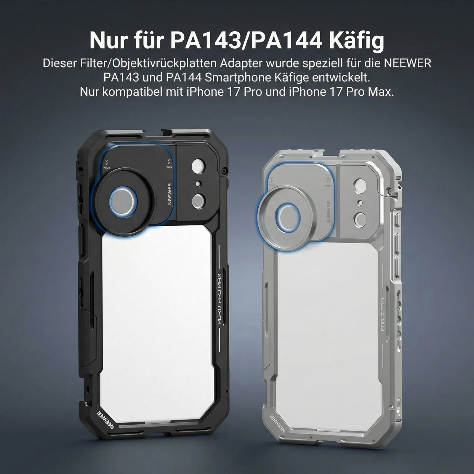 • Nur für PA143/PA144 Cage– Dieser Filter/Objektiv Backplate Mount Adapter wurde speziell für NEEWER PA143 und PA144 Smartphone Käfige entwickelt. Ausschließlich kompatibel mit iPhone 17 Pro und iPhone 17 Pro Max