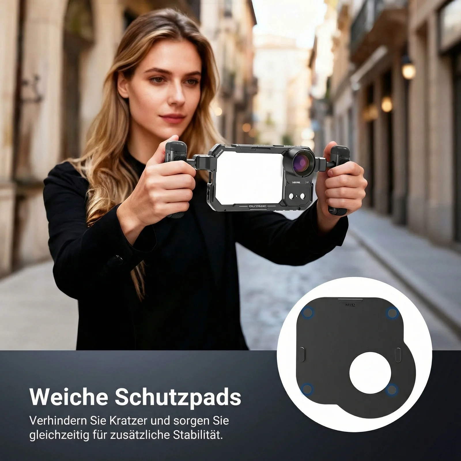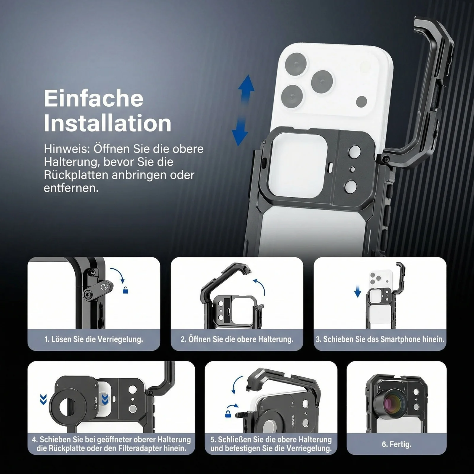 • 【Schnell Schiebe Befestigung】 Schieben Sie sie einfach auf die Phone Cage, bis sie einrastet – ganz ohne Werkzeug. Hinweis: Bitte öffnen Sie vor der Installation die obere Halterung des Käfigs