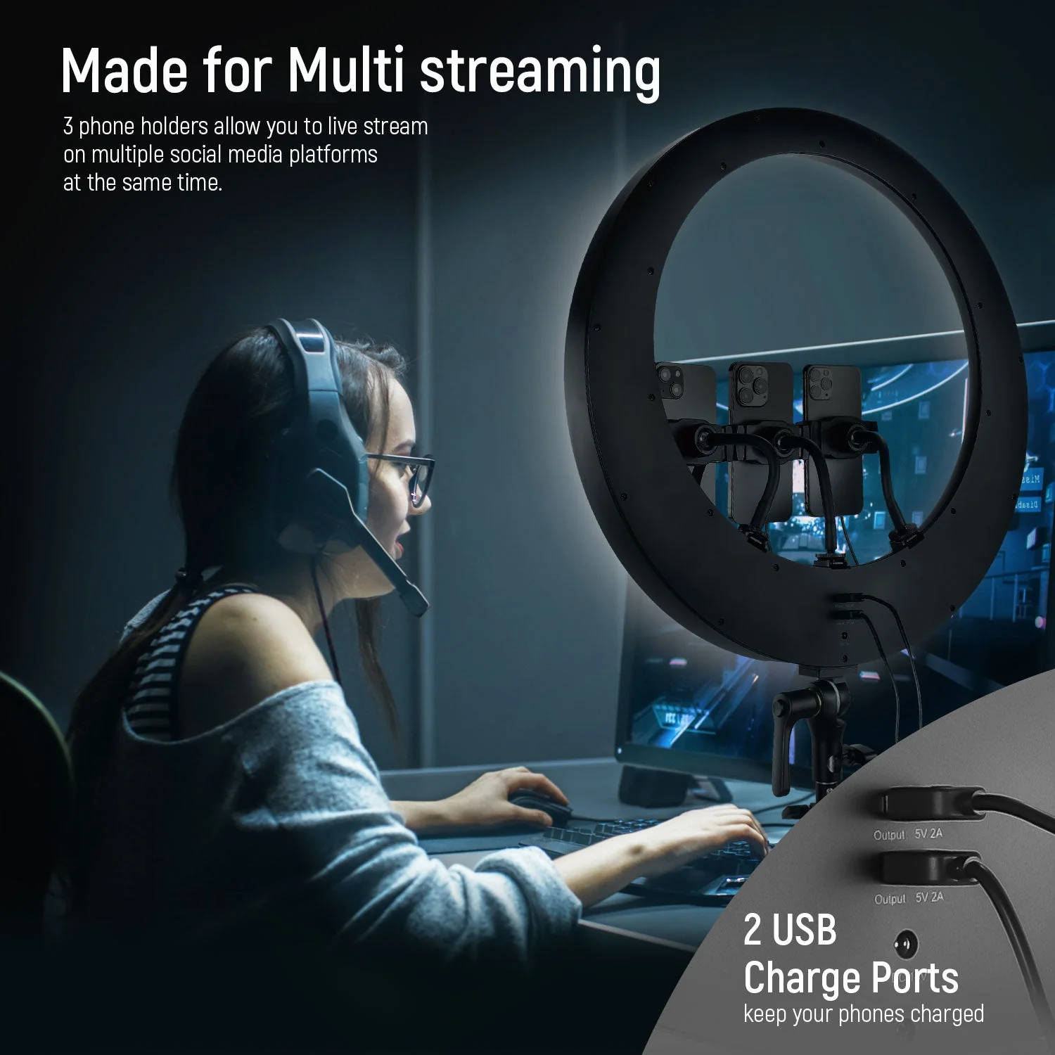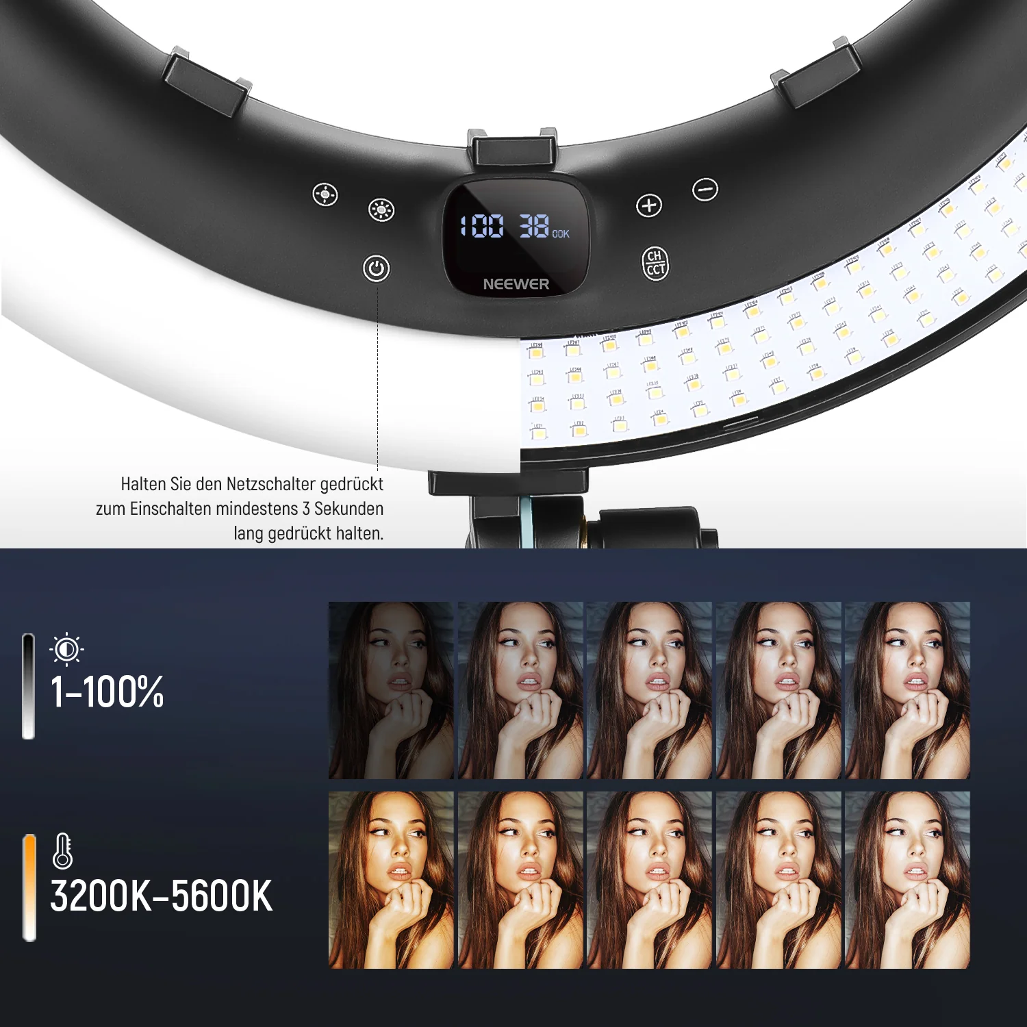 - Vereinfachte professionelle Beleuchtung– Dieses große Ringlicht bietet außergewöhnliche Helligkeit (0 % – 100 % einstellbar, 1 % Feineinstellung) und einen breiten Farbtemperaturbereich (3200 K-5600 K), was Ihre Live-Übertragung auf die nächste Stufe bringt. Der robuste Lichtständer aus Aluminiumlegierung bietet eine verstellbare Höhe (80 cm – 178 cm), um Ihre Konfiguration zu vervollständigen