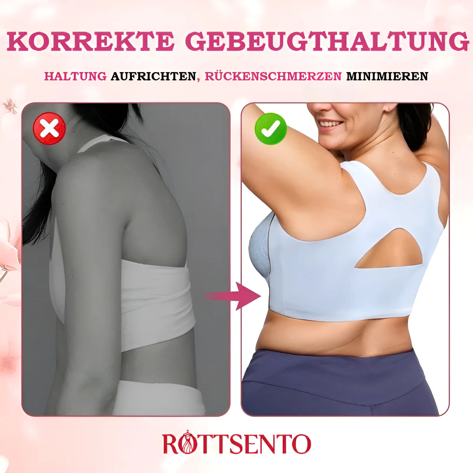 Mit zunehmendem Alter können hängende Brüste den Rücken nach vorne ziehen und starke Schmerzen verursachen. Die X-Träger von Rottsento richten die Haltung sanft auf und lindern so tägliche Rückenschmerzen.