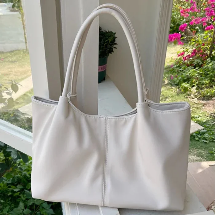 Diese Tasche bietet hochwertiges Kunstleder, minimalistisches weißes Design, großes Innenfach, weiche Underarm-Trageriemen und vielseitige Nutzung für Schule, Shopping & Alltag.