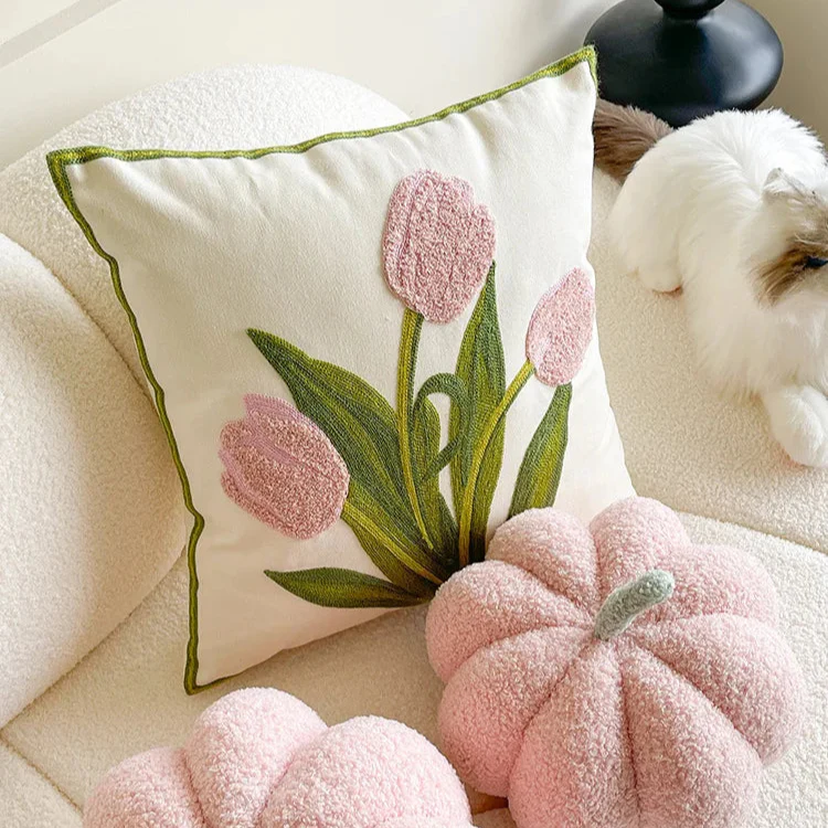 Das Zusammenspiel aus Tulpenmotiv und Kürbisform macht dieses Kissen sowohl dekorativ als auch komfortabel. Der zarte Rosaton sorgt für Frische, während die weiche Füllung angenehme Unterstützung für Rücken, Taille oder Kopf bietet.