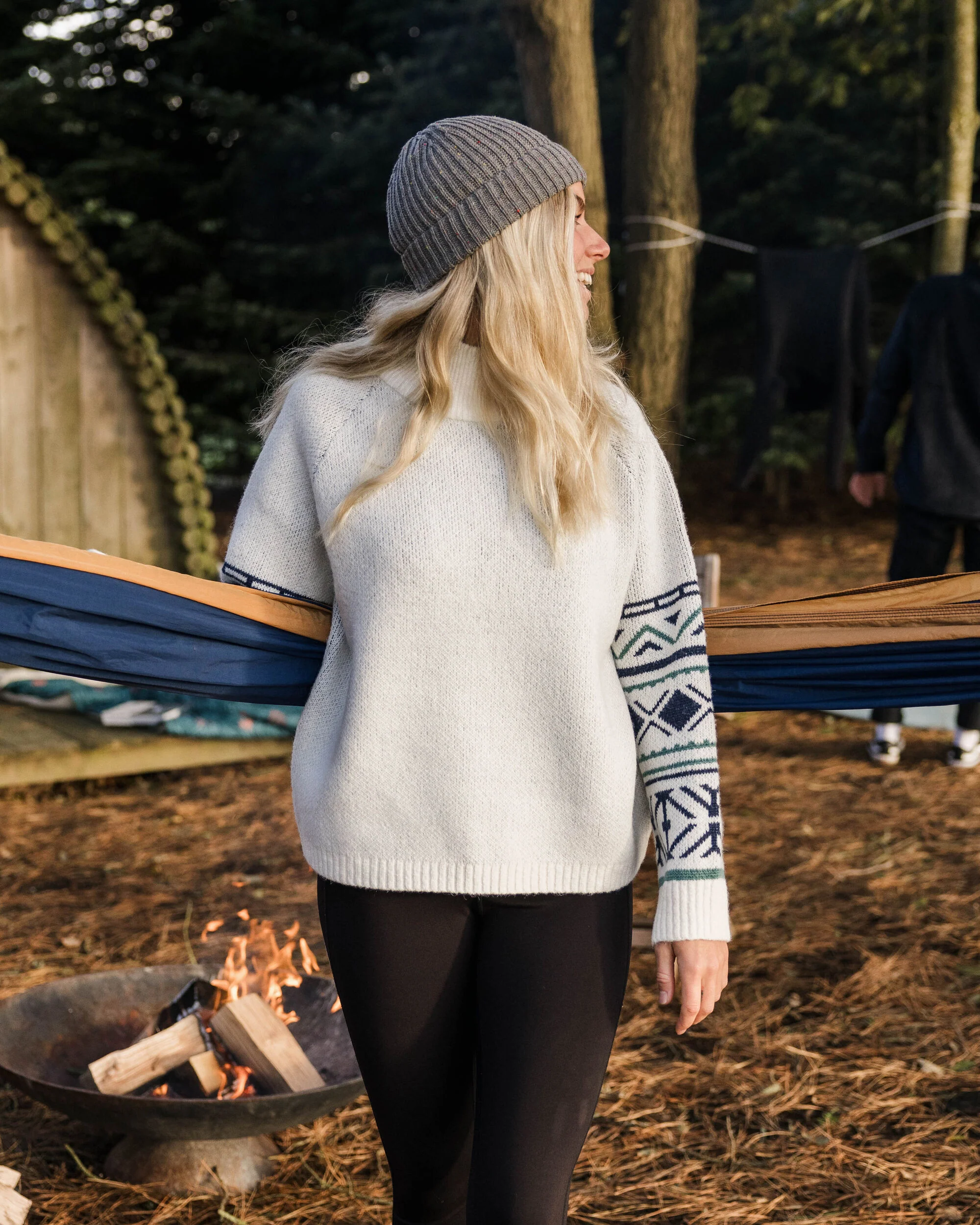 Flüchte in die von Baumkronen bedeckte Wildnis mit dem Ambience Strick. Hergestellt aus recyceltem Garn mit einem gemütlichen Stehkragen, ist es perfekt für die Nächte am Lagerfeuer.