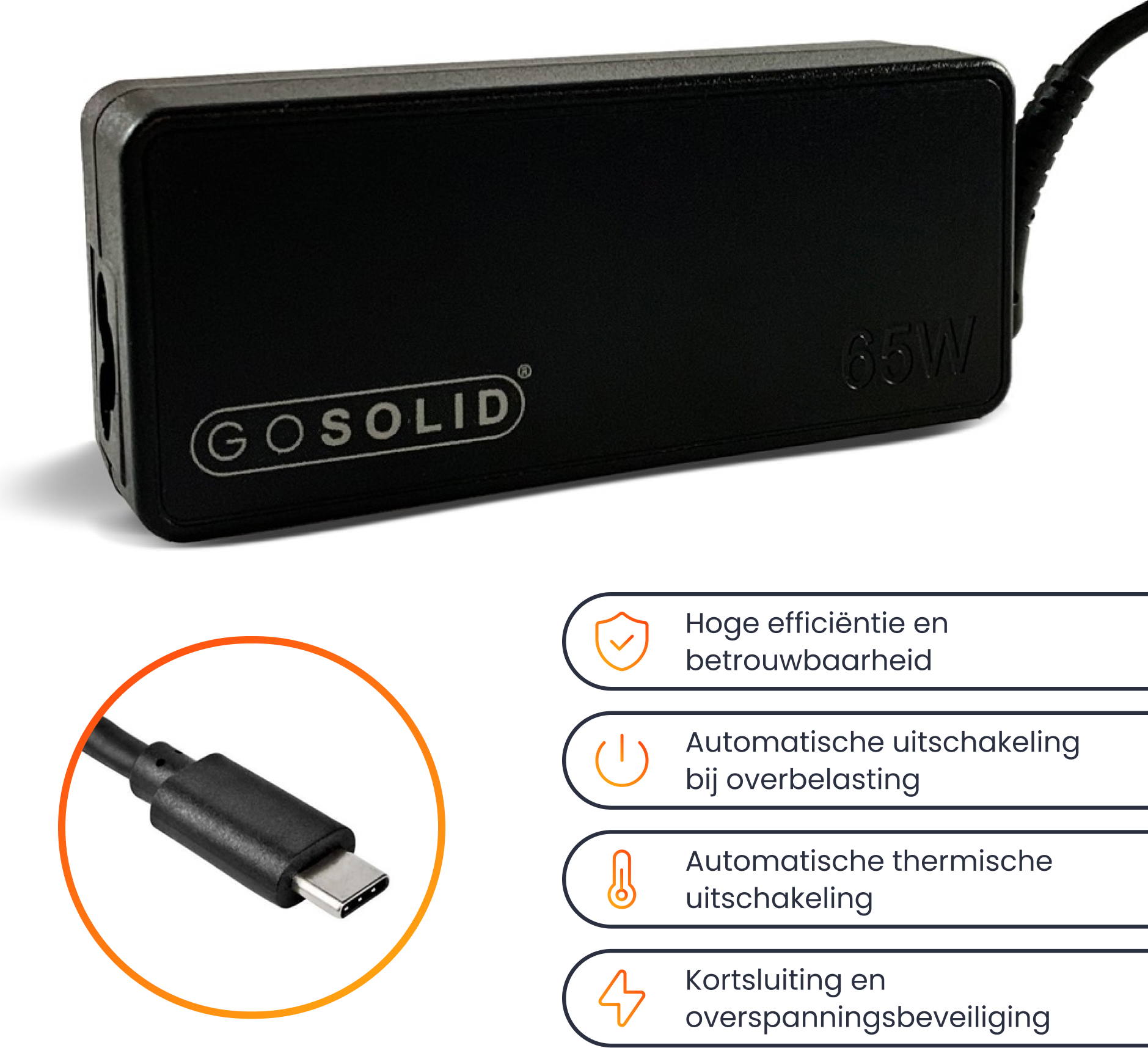 Das GO SOLID! USB-C Ladegerät ist mit mehreren intelligenten Sicherheitsfunktionen ausgestattet, die dafür sorgen, dass Ihr Gerät immer gut geschützt ist. Das Aufladen Ihres Laptops erfolgt somit extrem schnell und sicher.
