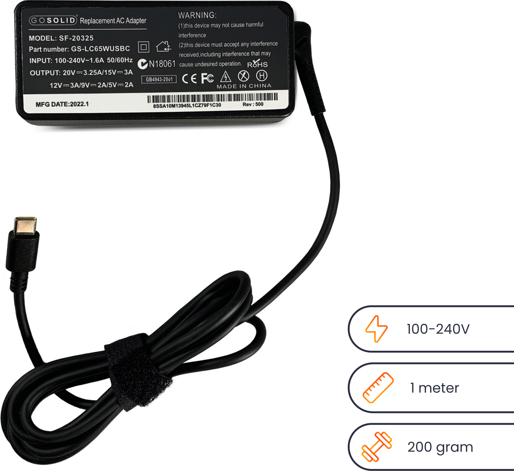 Das GO SOLID! Netzteil hat eine Gesamtlänge von 2,5 Metern, sodass Sie Ihr Laptop fast überall aufladen können.