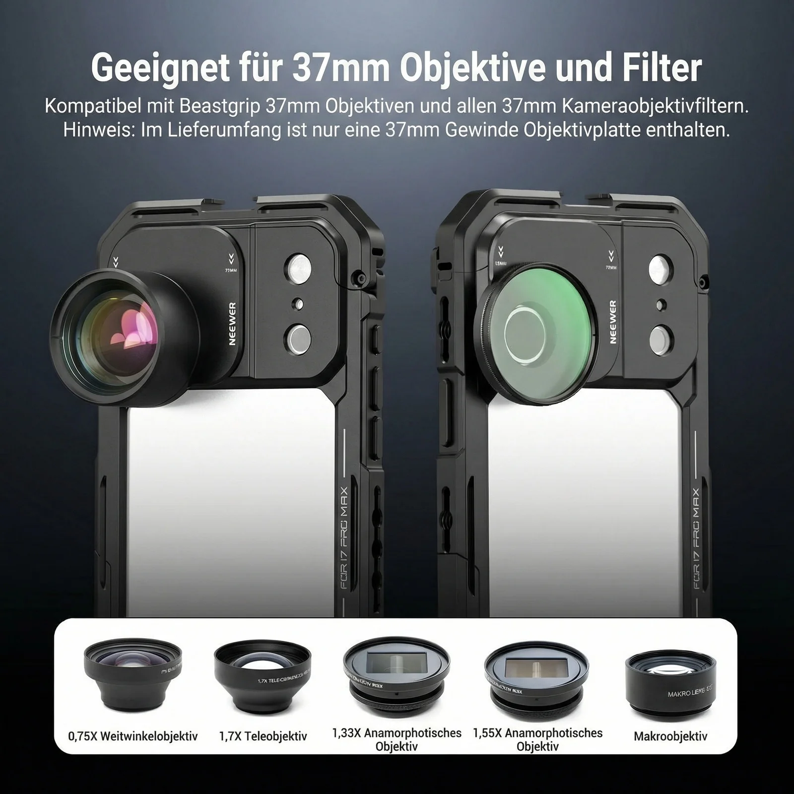 • Nur für PA143/PA144 Cage– Dieser Filter/Objektiv Backplate Mount Adapter wurde speziell für NEEWER PA143 und PA144 Smartphone Käfige entwickelt. Ausschließlich kompatibel mit iPhone 17 Pro und iPhone 17 Pro Max