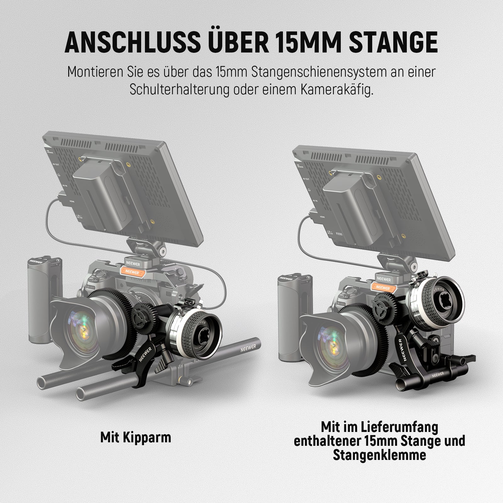 - 【Flexible Armpositionierung】 Mit einer einzigen 15mm Stabklemme kann der Arm PG001 an einen Kamerakäfig oder ein Schulter Rig angeschlossen und um 138° geneigt werden, um Kinokameras, DSLR Kameras und Objektive verschiedener Größen aufzunehmen