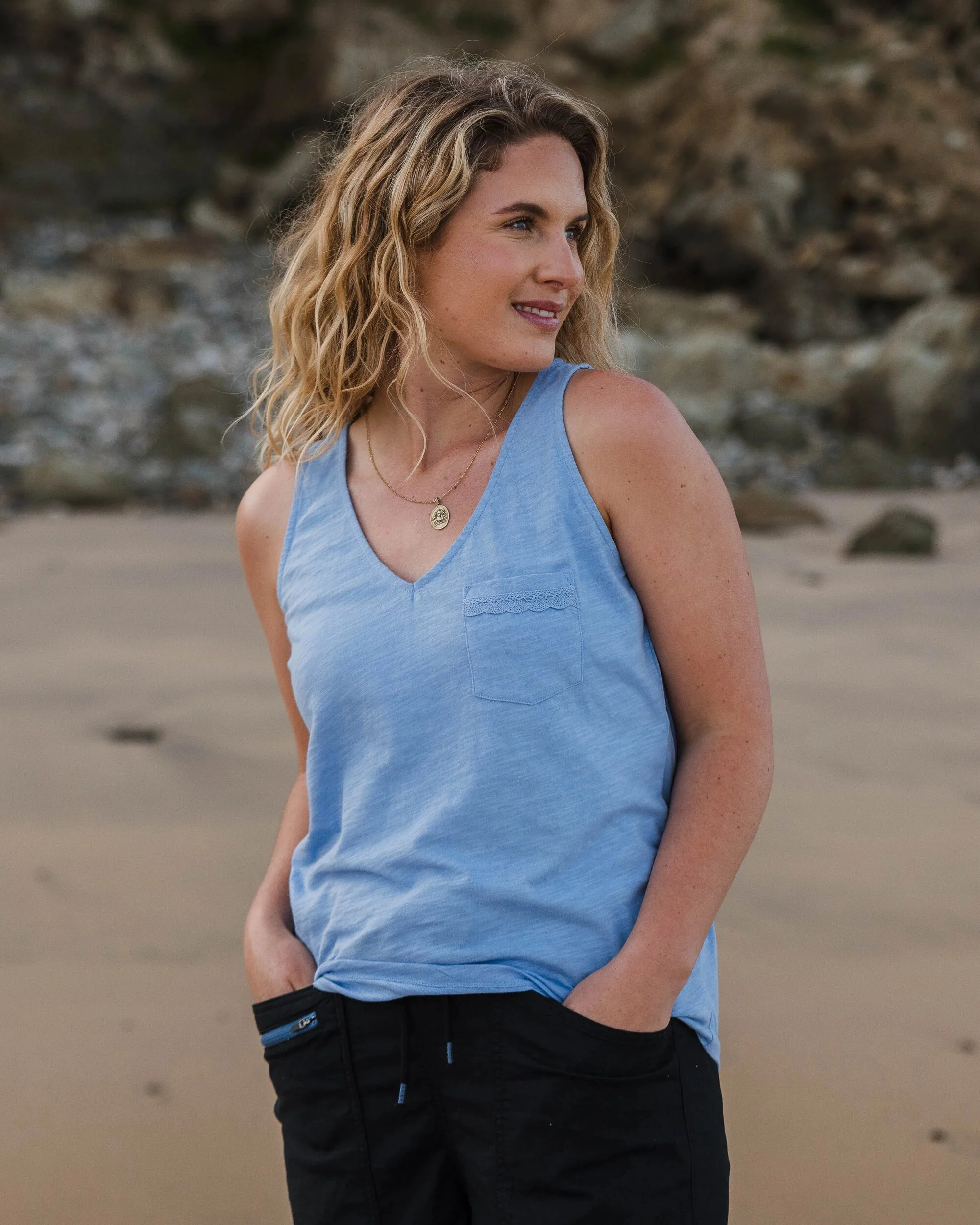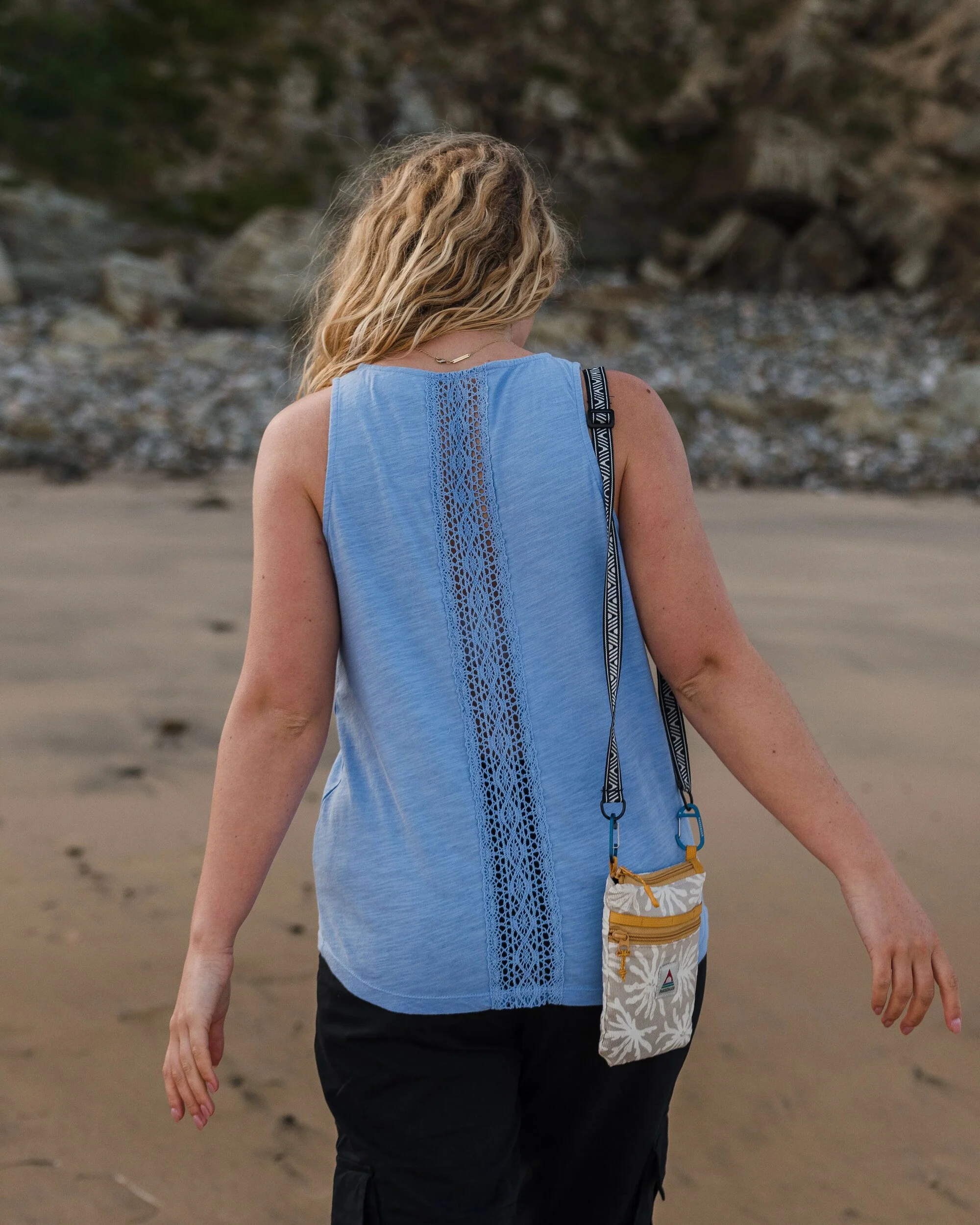 Eine lässige Sommerlage mit gewebtem Rückendetail für den Vintage-Boho-Vibe. Das Rivergate besteht aus weichem recyceltem Baumwolljersey und passt perfekt zu Jeans oder deiner Lieblingsshorts.